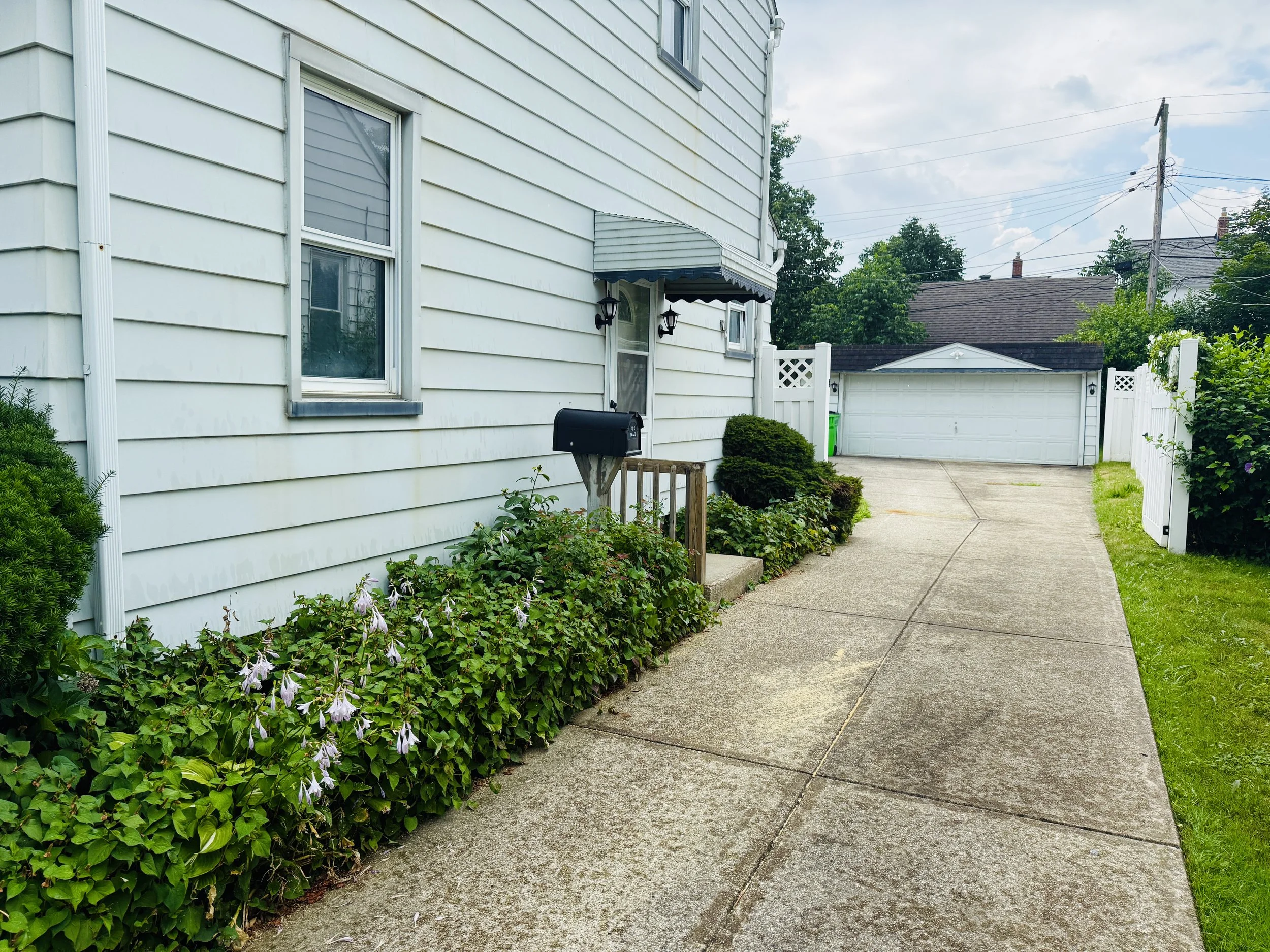 Concrete walkway beside a white house with green bushes and flowering plants, leading to a white garage gate.