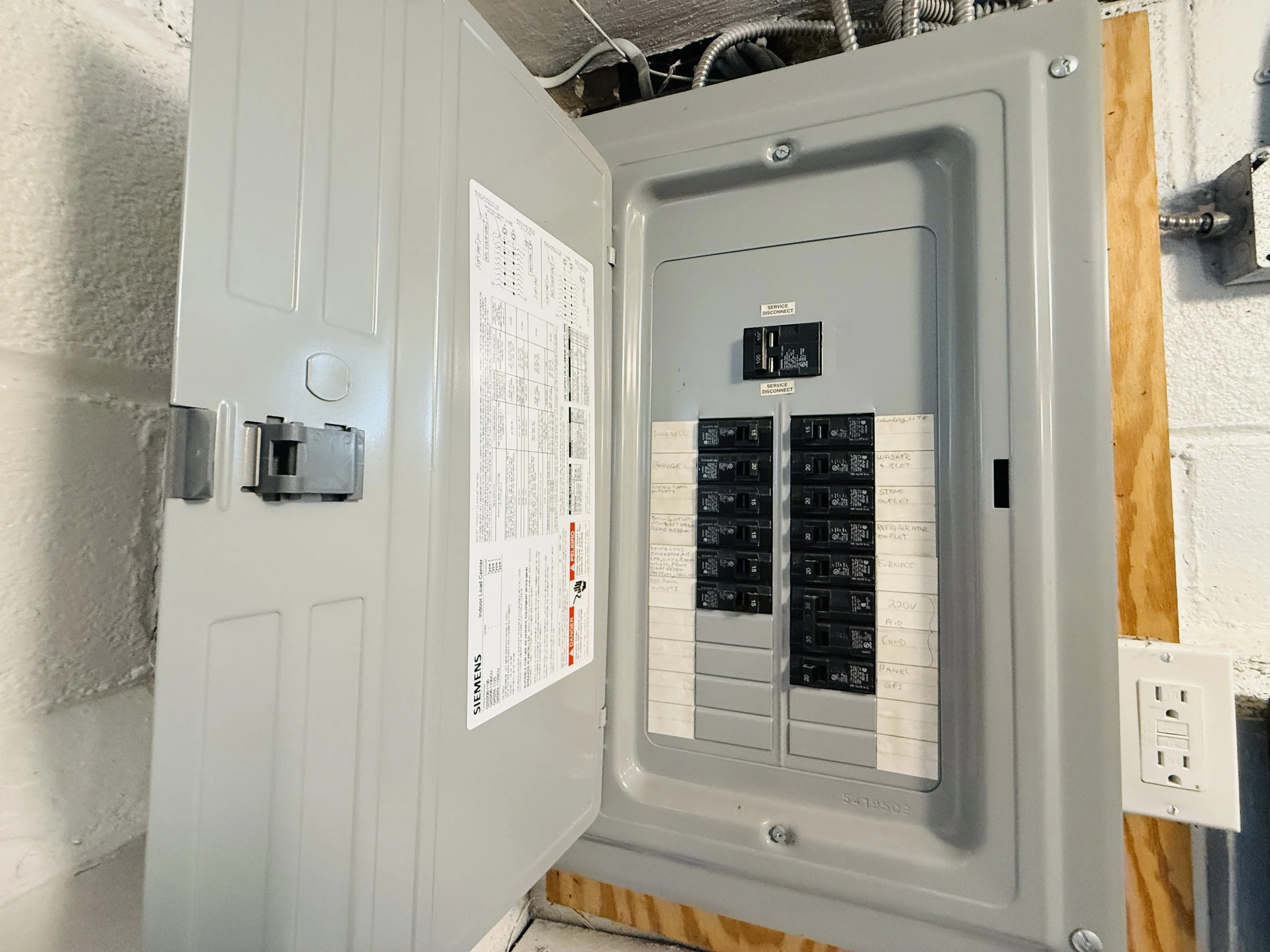 Electrical breaker box with multiple circuit breakers and labeled handwritten notes inside, mounted on a wall.