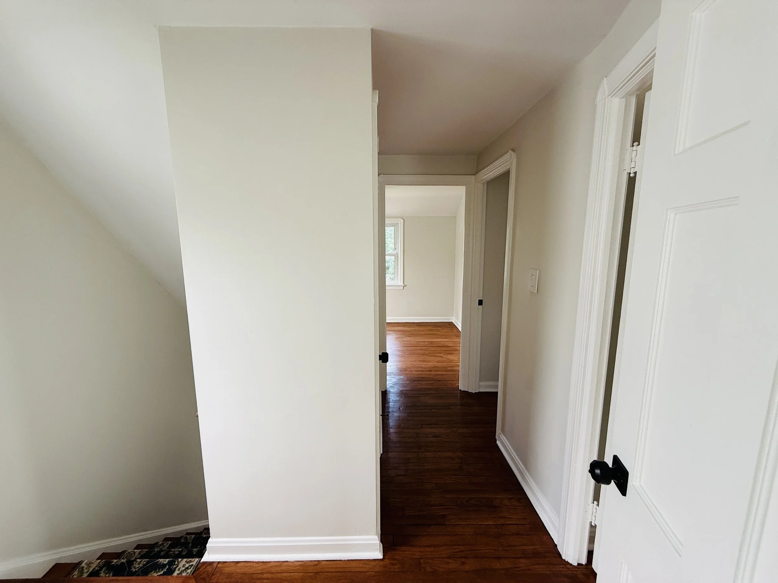 Interior view of a home hallway with white walls, hardwood floors, multiple doorways, and a staircase partially visible on the left.