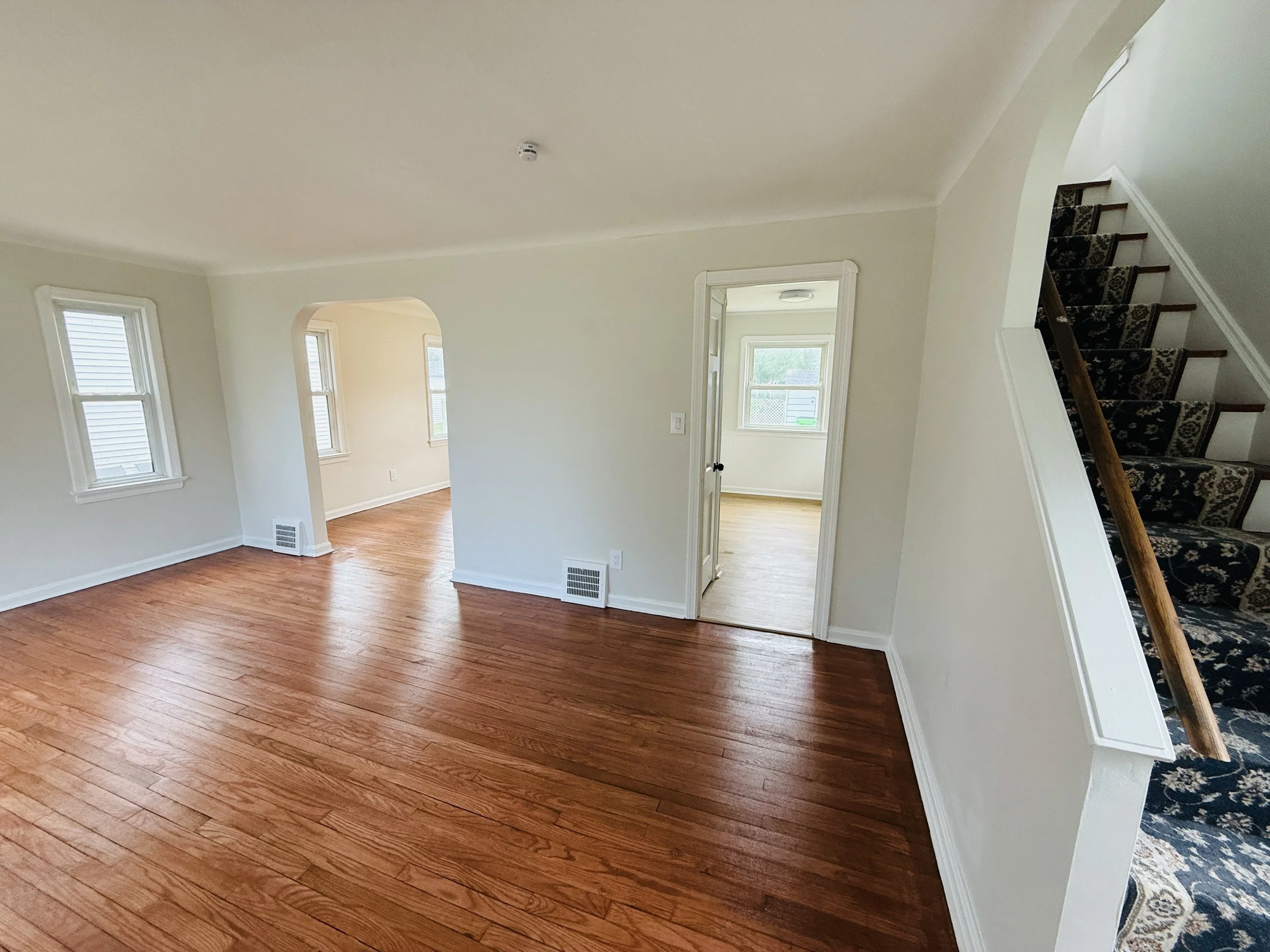 Empty living room with hardwood floors, white walls, multiple windows, and a staircase with a dark floral carpet runner.