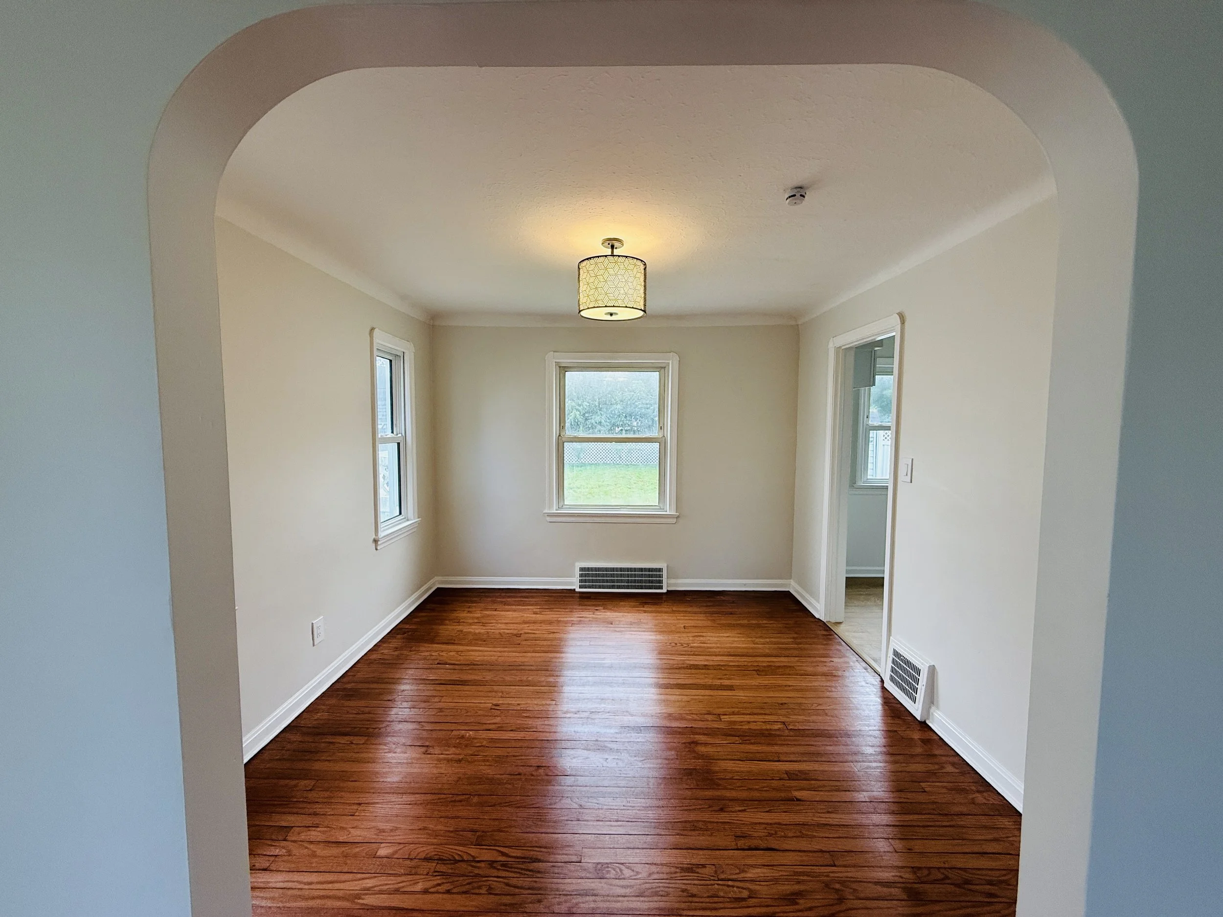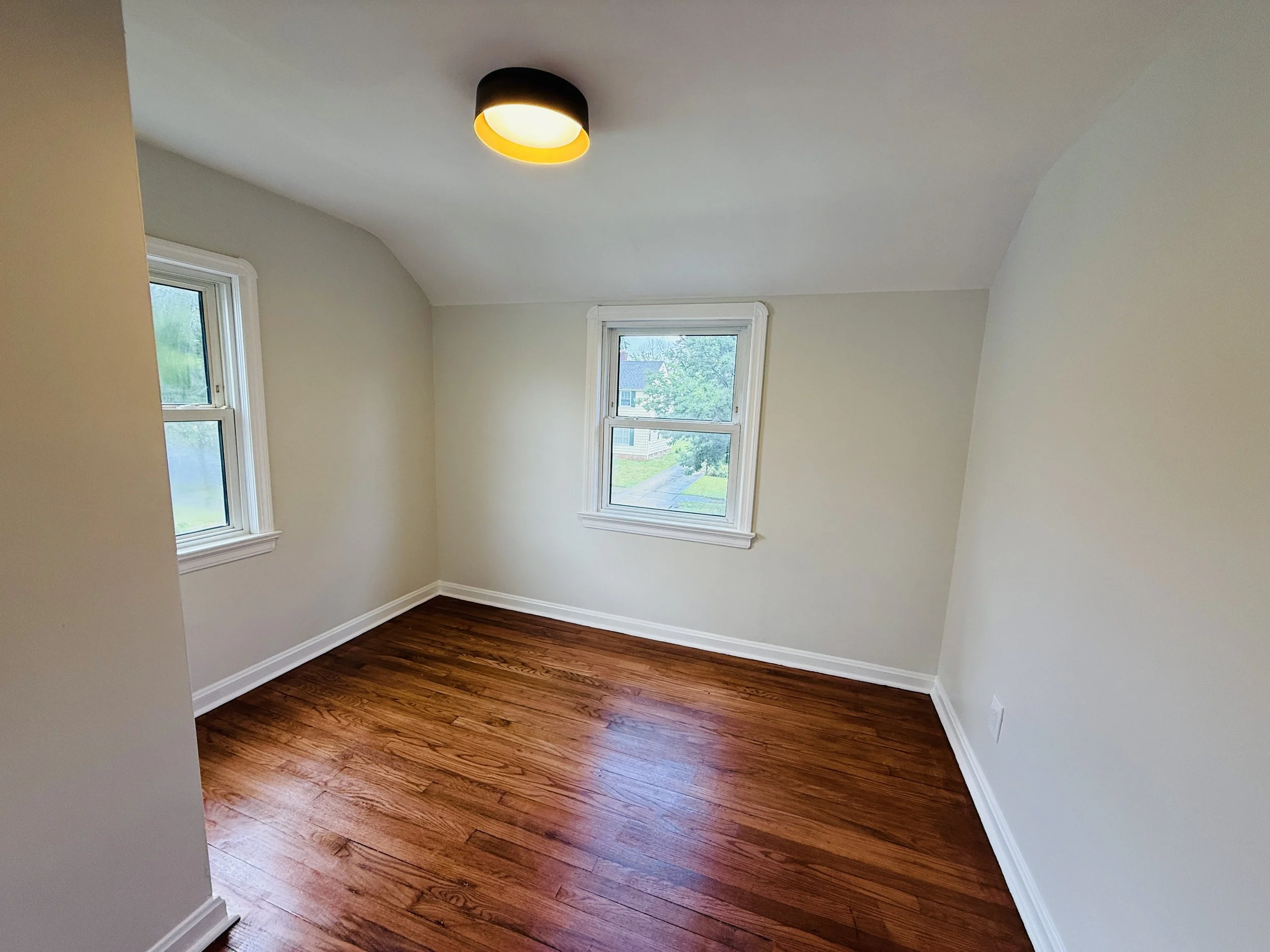 Empty room with hardwood floors, two windows, cream walls, and a ceiling light.