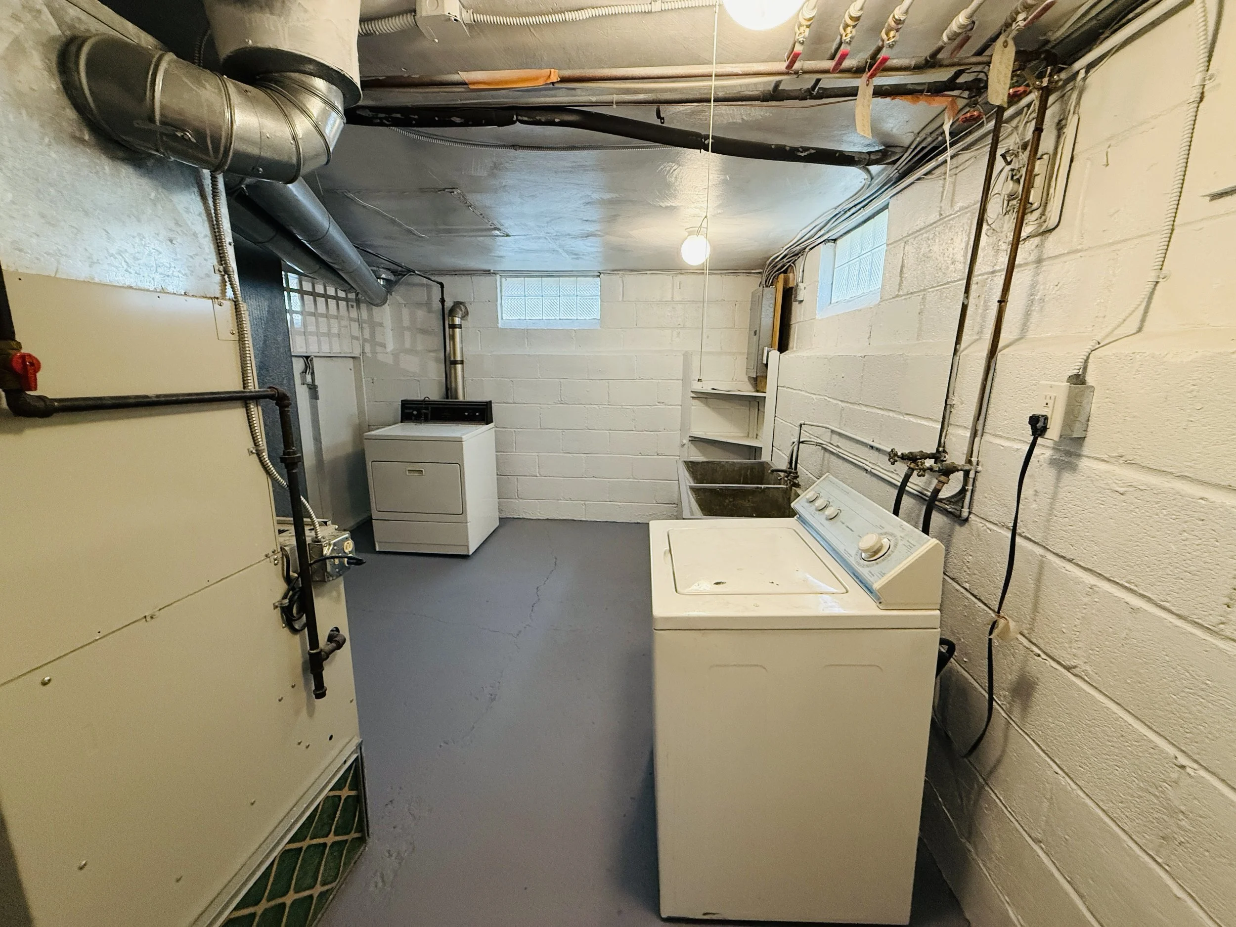 Basement laundry room with a washing machine, utility sink, and exposed piping on brick walls.