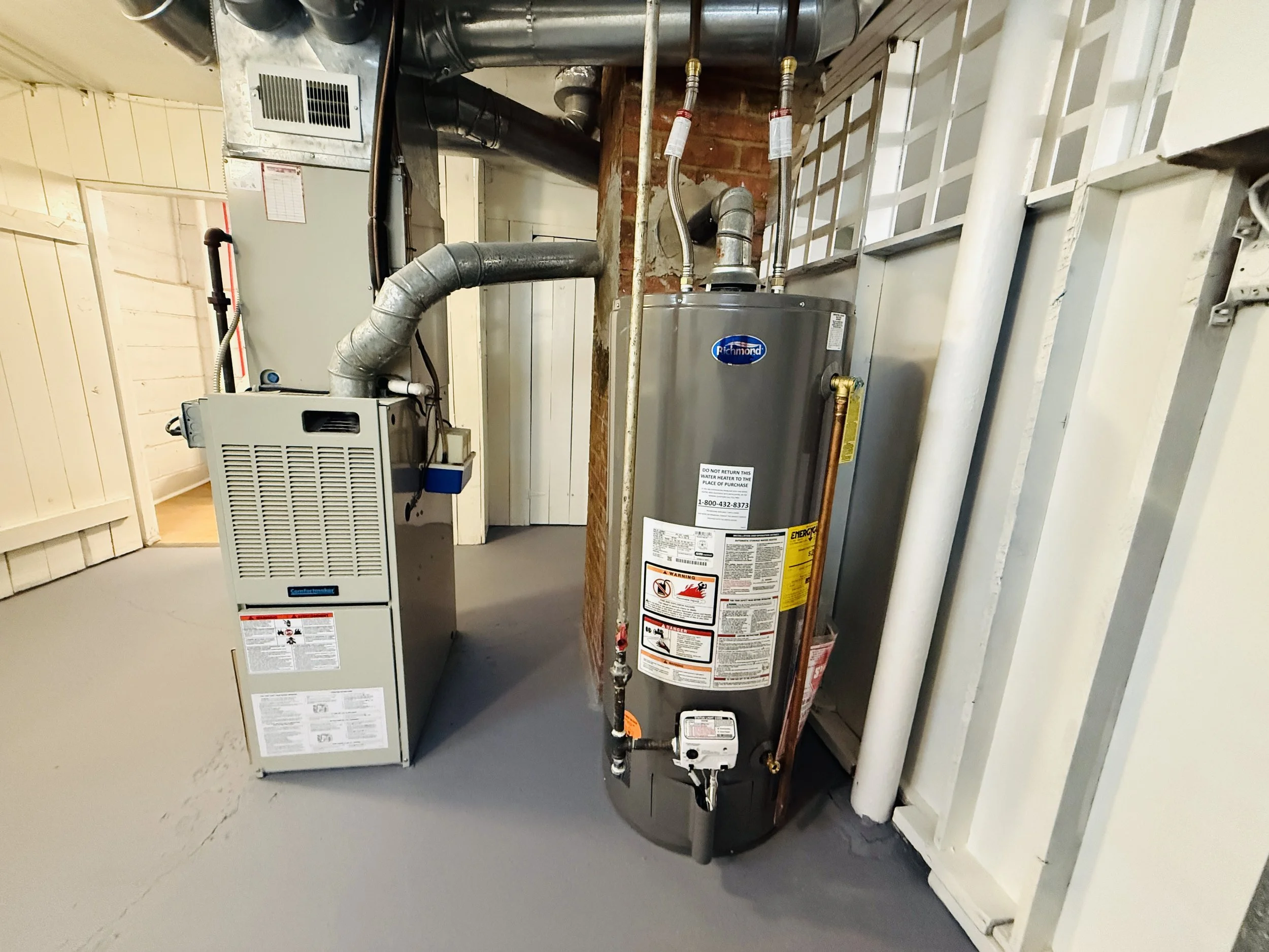 A water heater and HVAC system in a utility room.