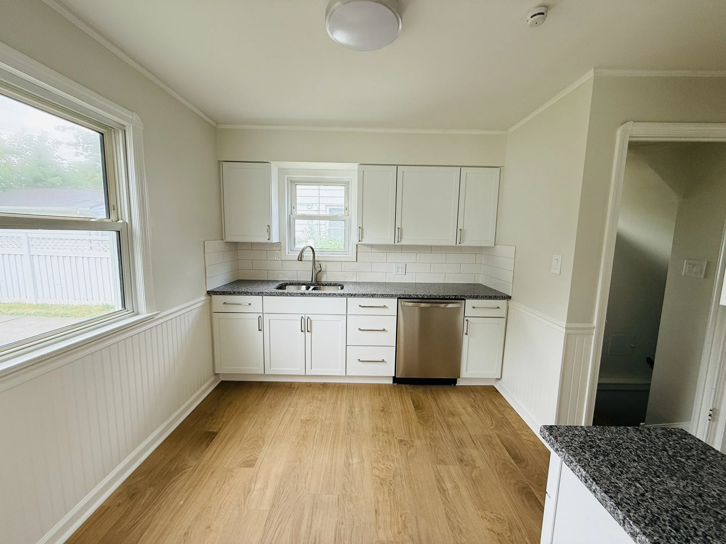 Empty kitchen with white cabinets, granite countertops, a stainless steel dishwasher, and wood flooring, with two windows and a small window above the sink.