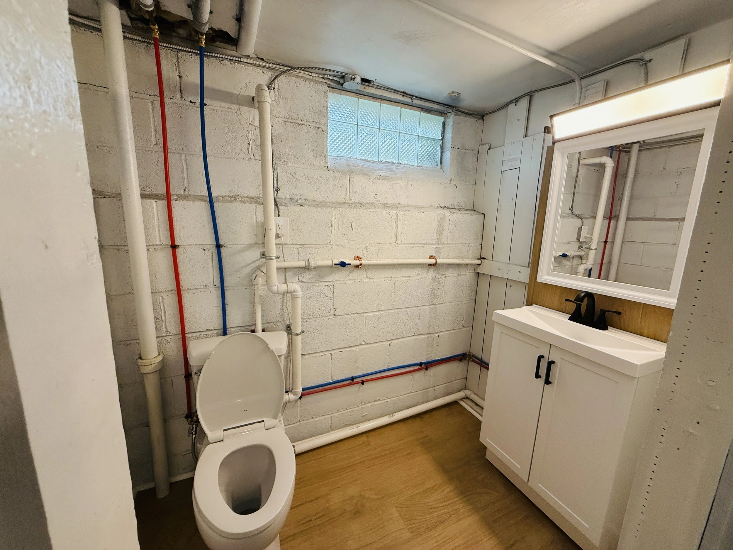 A bathroom with an unfinished brick wall, exposed plumbing, a small window, a white vanity with a mirror, and a toilet.