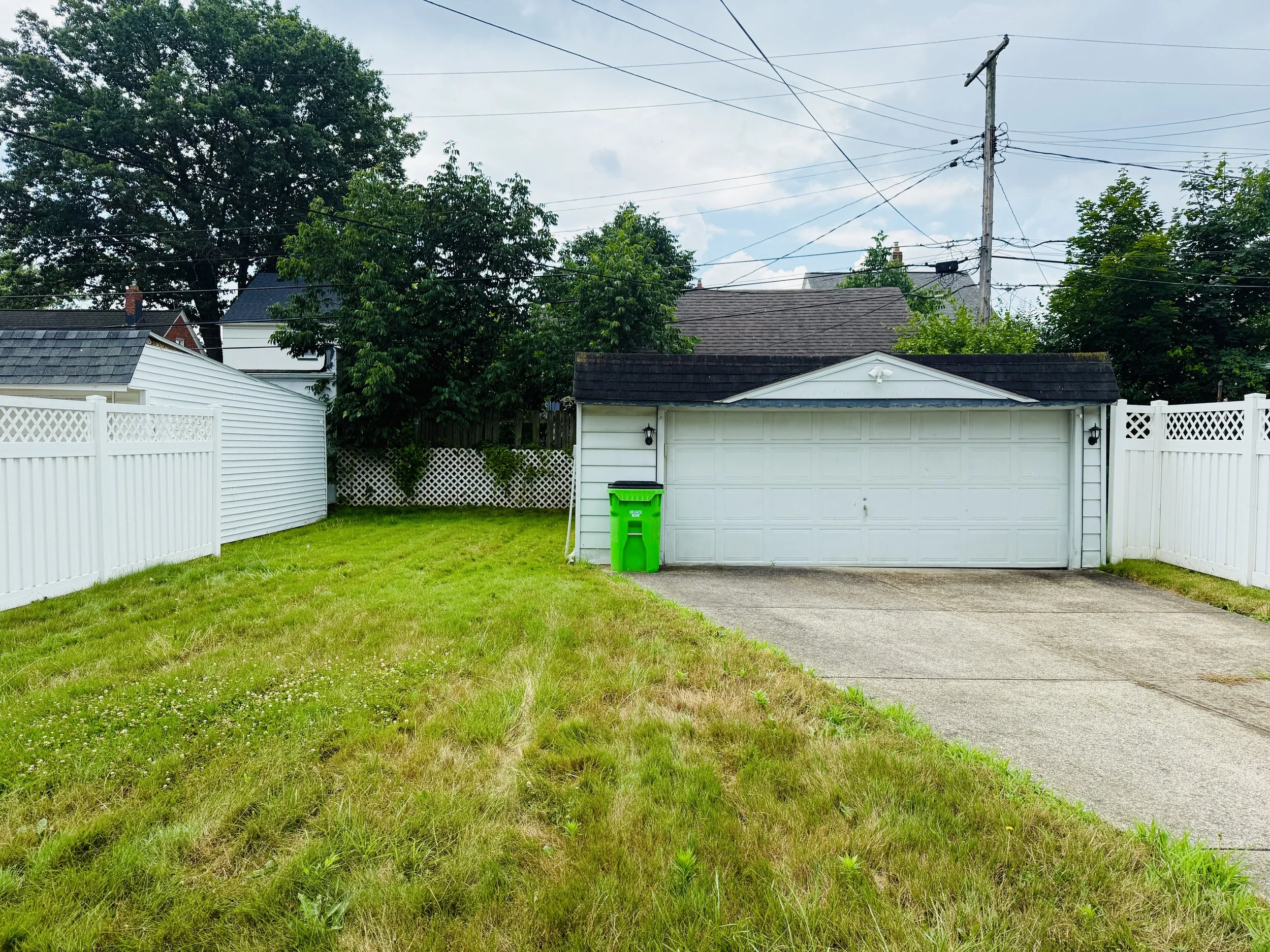 A backyard with a green lawn, white fence, a garage with a white door, a green trash bin, and a concrete driveway.