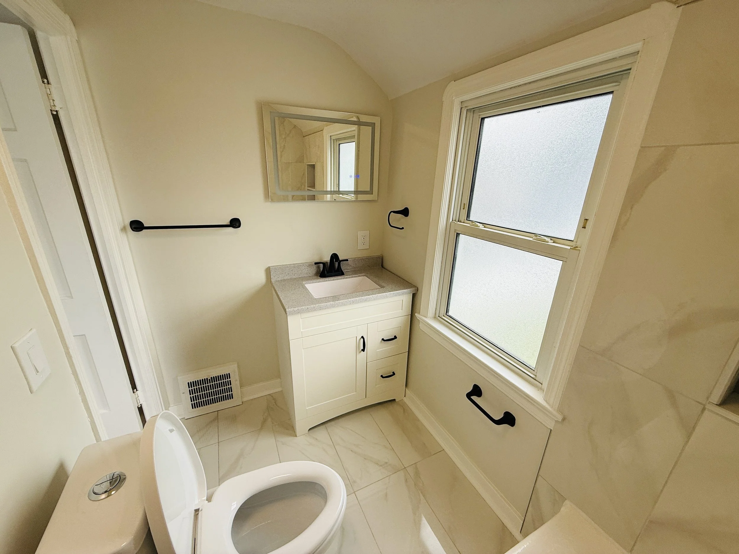 Small bathroom with a white toilet, a vanity with a black faucet, a mirror, frosted window, and black towel holders.