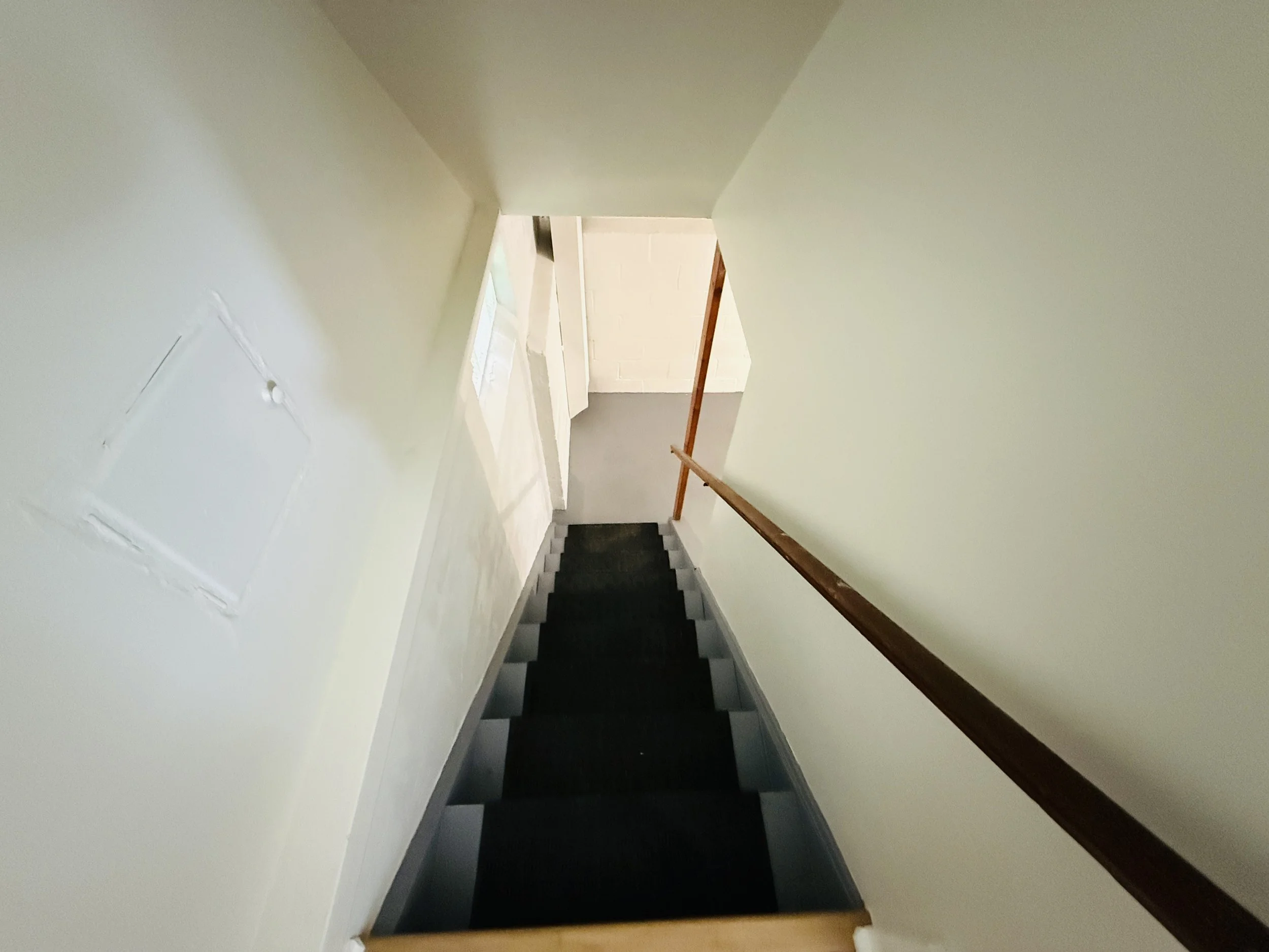 Top-down view of a staircase with black steps, wooden handrails, and light-colored walls leading down to a small landing and a door.