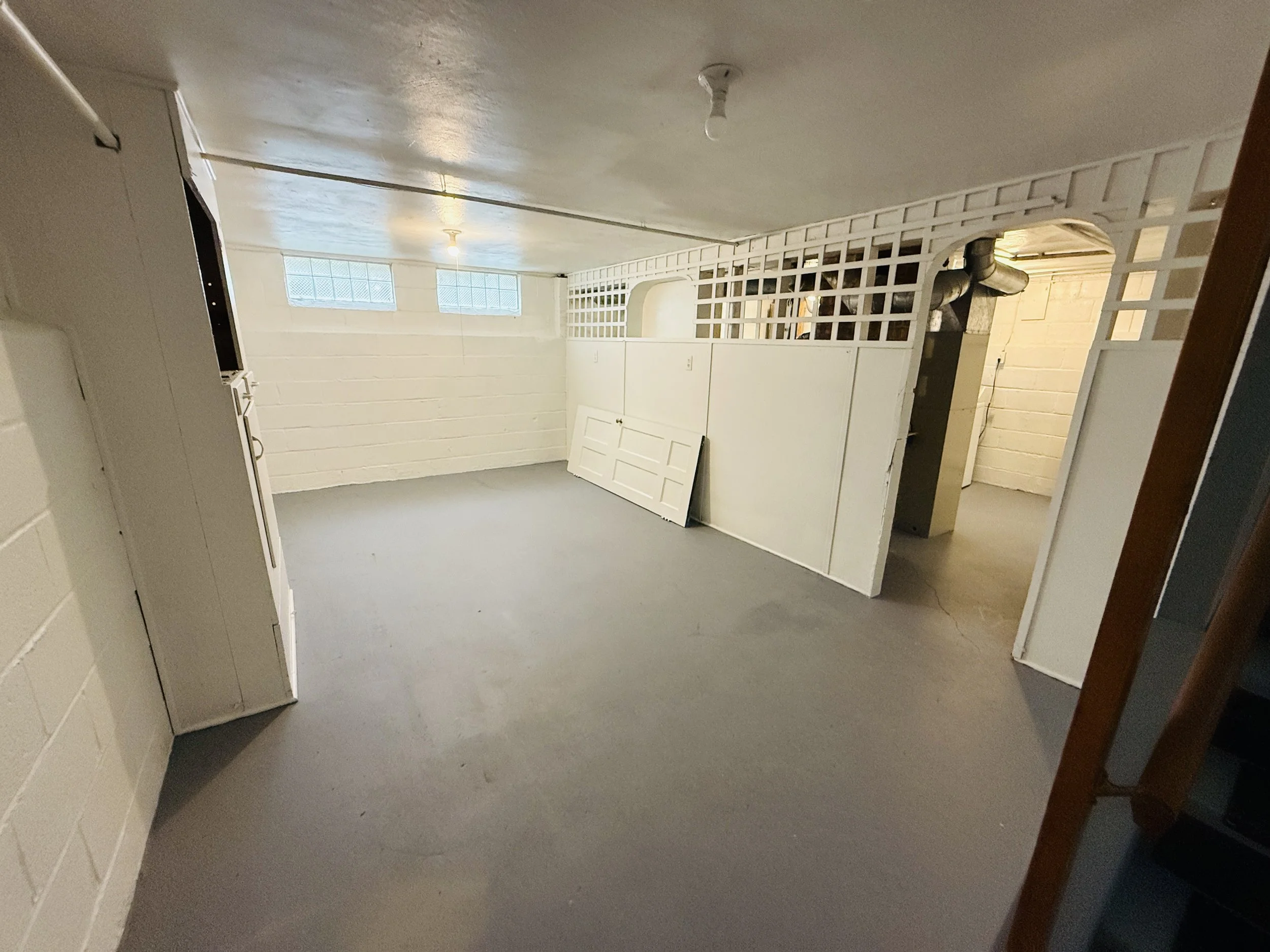 Empty basement room with white painted bricks, a small window, and fluorescent lighting, featuring a partial wall with a door leaning against it and a wood staircase on the right.