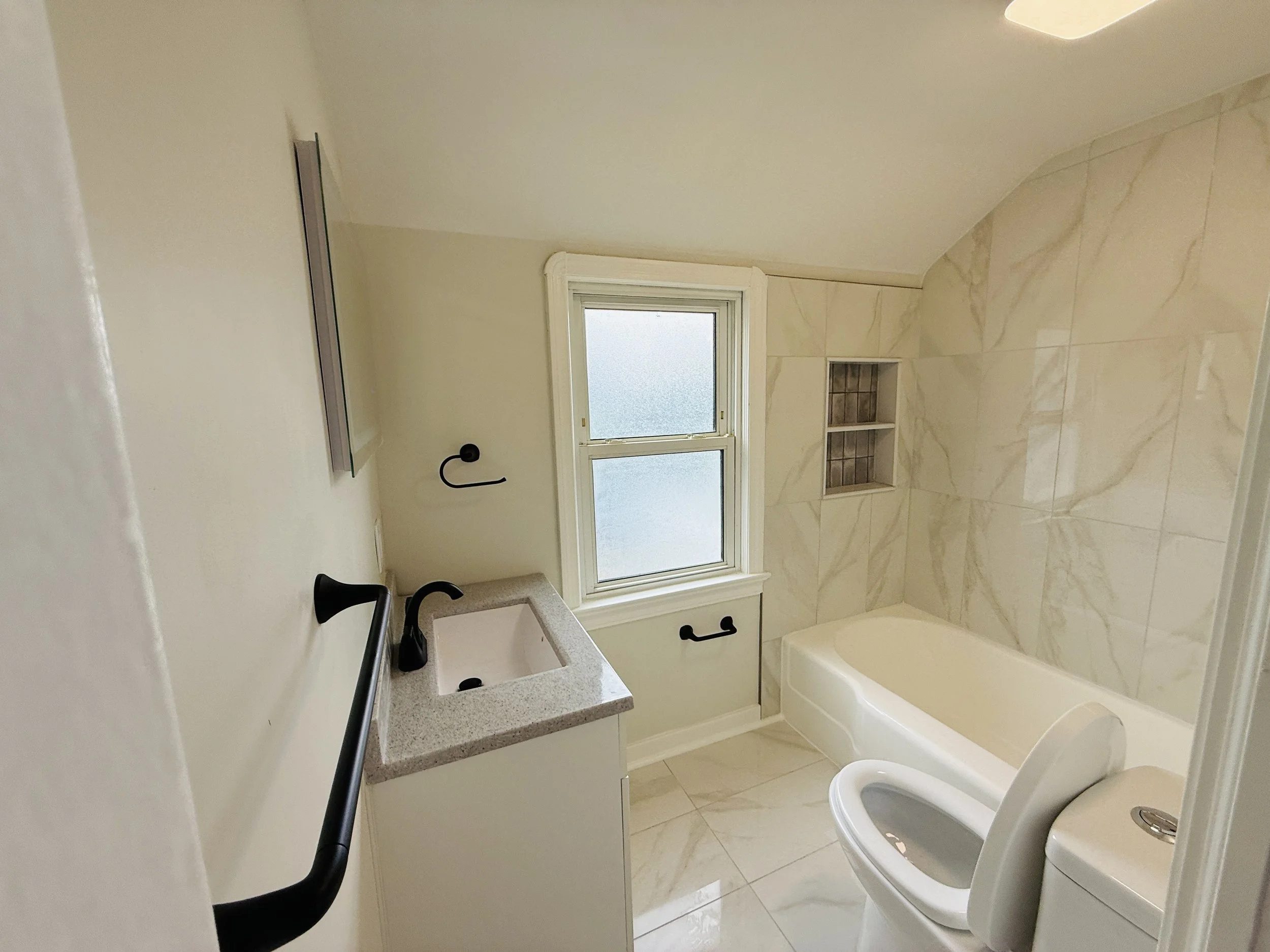 Bathroom with a bathtub, toilet, small sink, window, and tiled walls and floor.