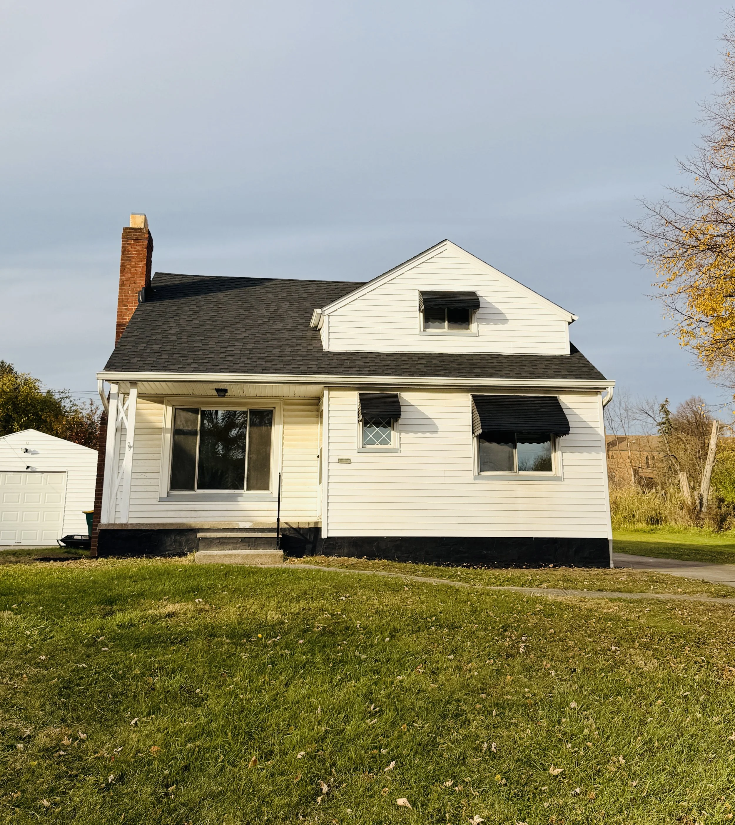 A two-story house with white siding, black window awnings, and a black shingle roof. It has a chimney on the left side and steps leading to the front door. There is a small white shed in the background on the left, and the yard is grassy with some tr