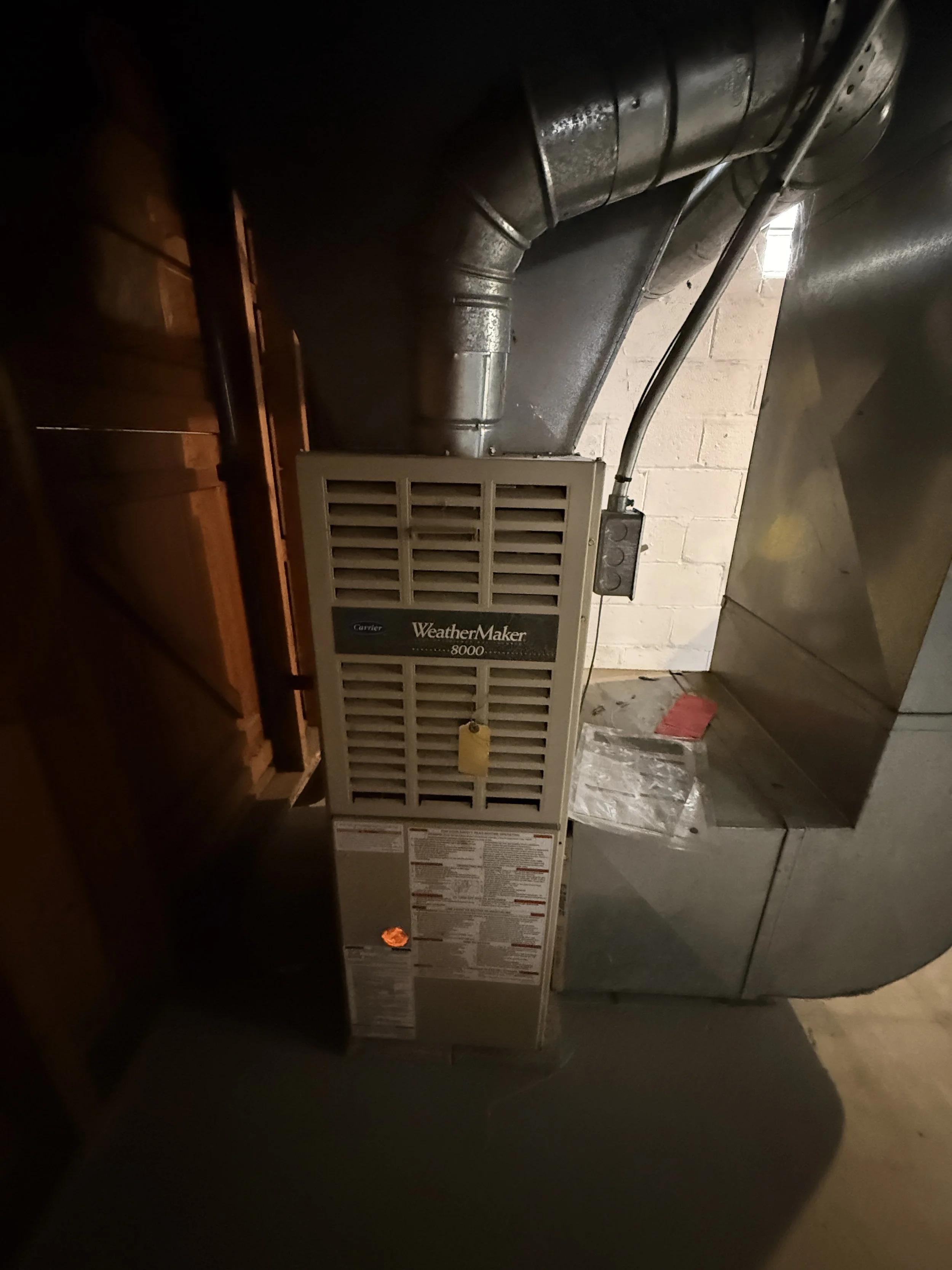 A WeatherMaker 8000 furnace unit in a basement next to ductwork and a brick wall.