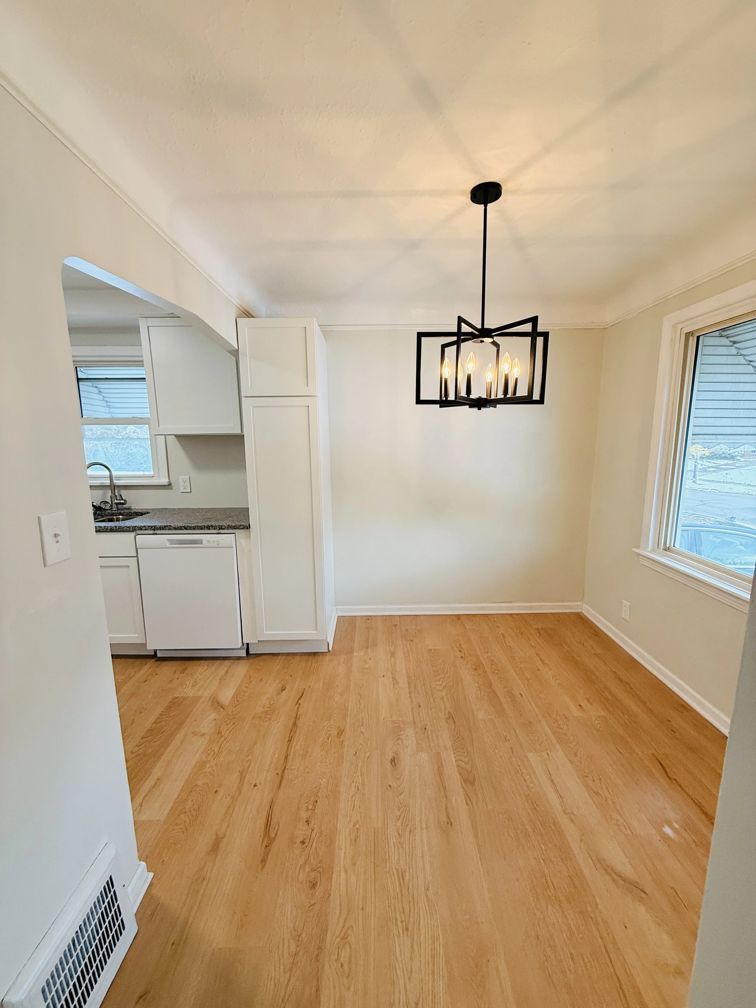 Empty dining room with hardwood floors, a modern black chandelier, a large window with blinds, and a small adjacent kitchen area with white cabinetry and a granite countertop.