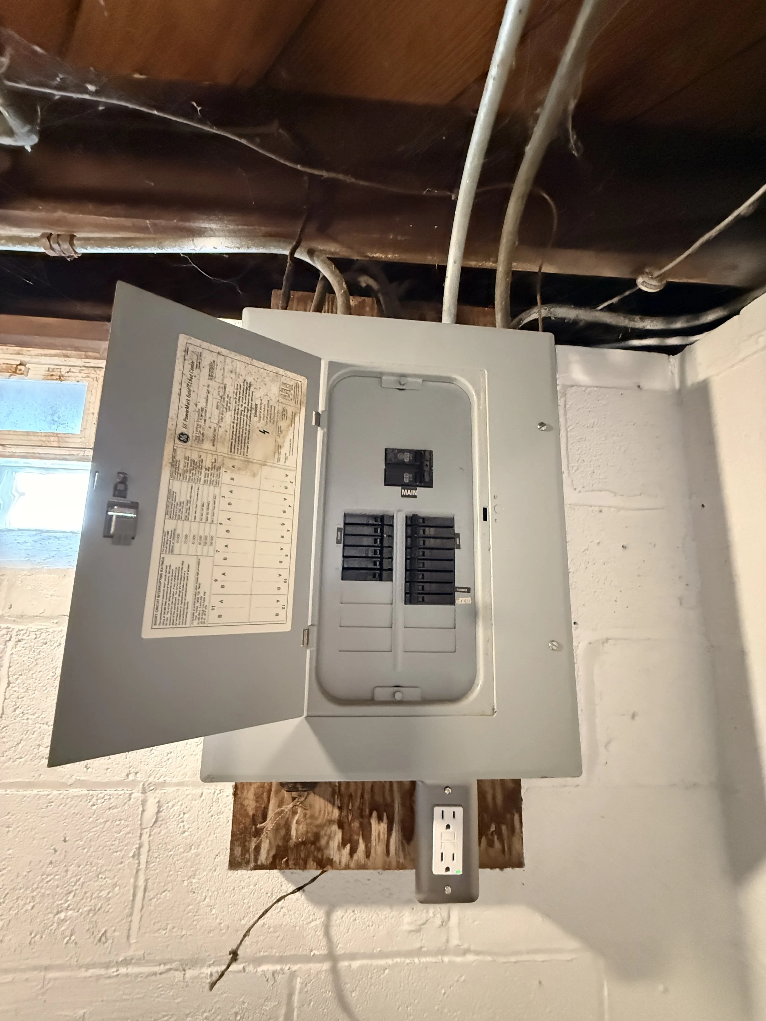 An open electrical breaker box mounted on a wall, with black circuit breakers, a label, and a power outlet below it, in a basement or utility room.
