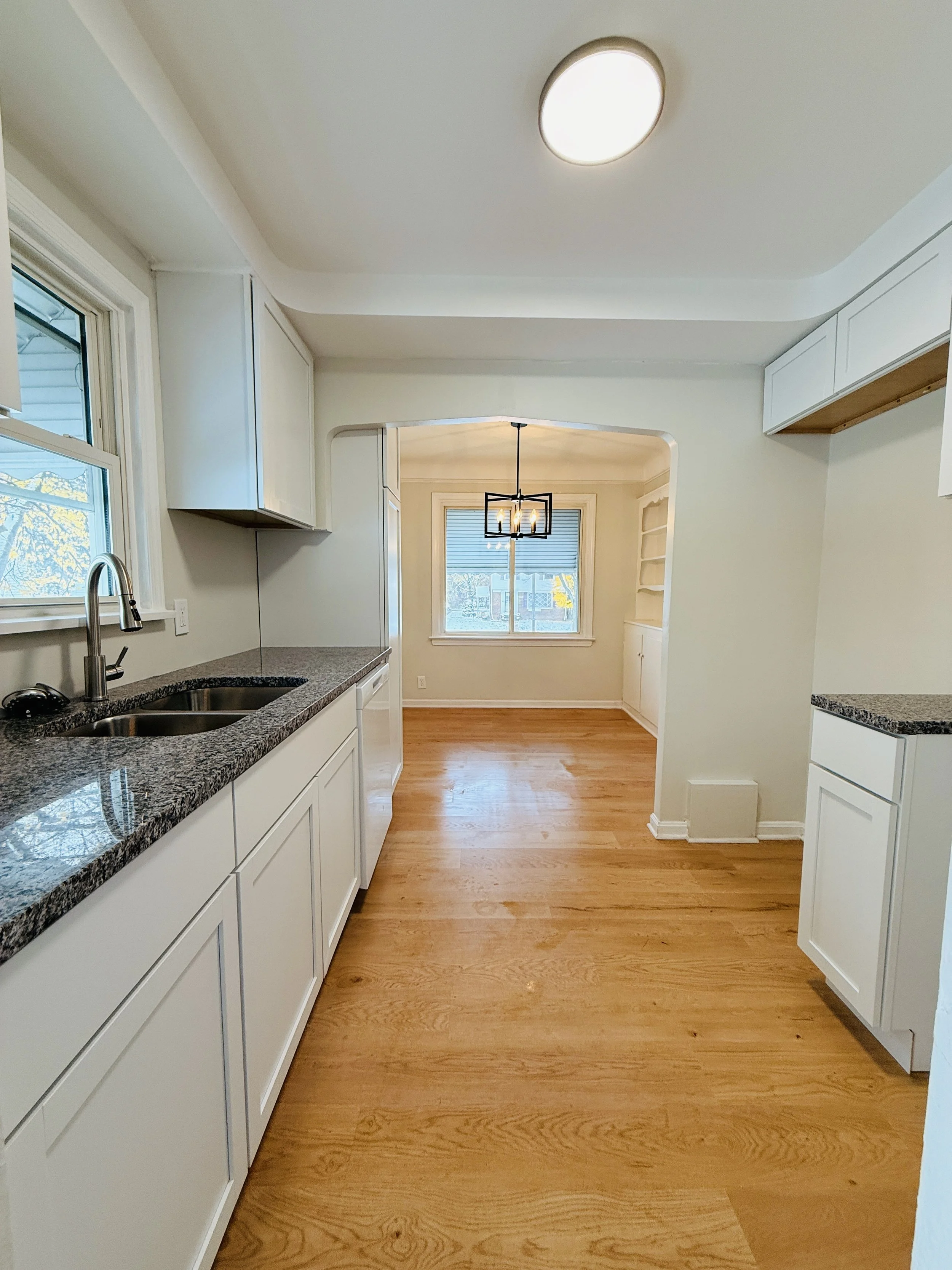 Empty kitchen with white cabinets, dark granite countertops, a double sink, and a hardwood floor. A doorway leads to a dining area with a window, a chandelier, and built-in shelves.