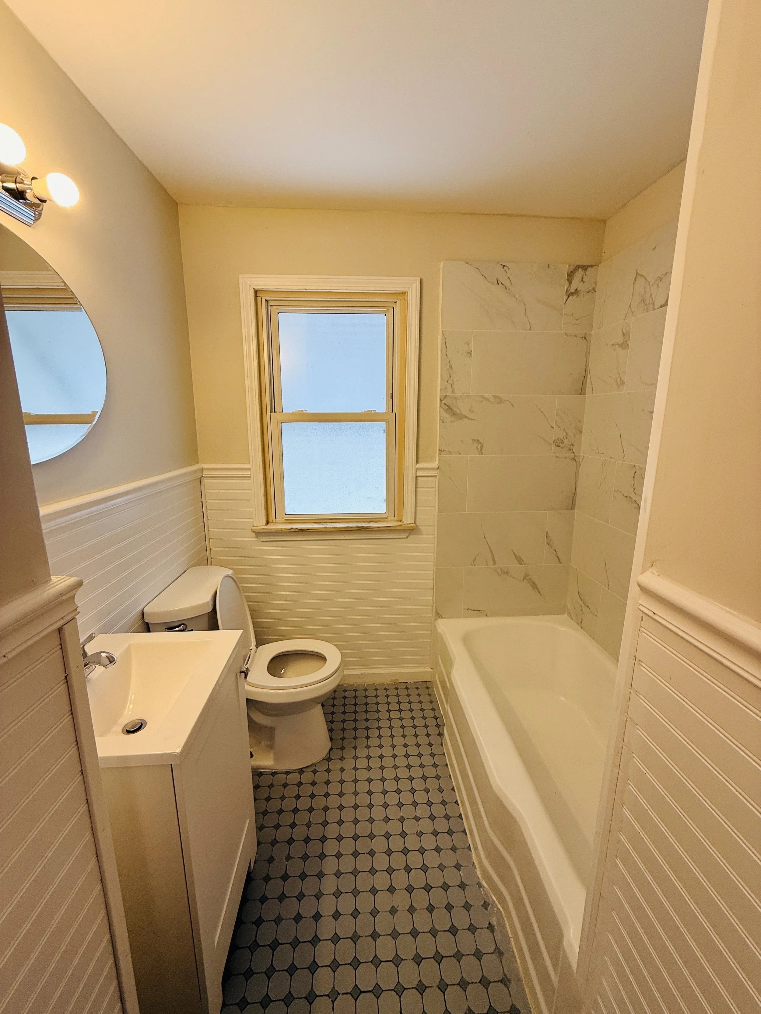 Small bathroom with a bathtub, a toilet, a small sink, a mirror, a window, and hexagonal floor tiles.