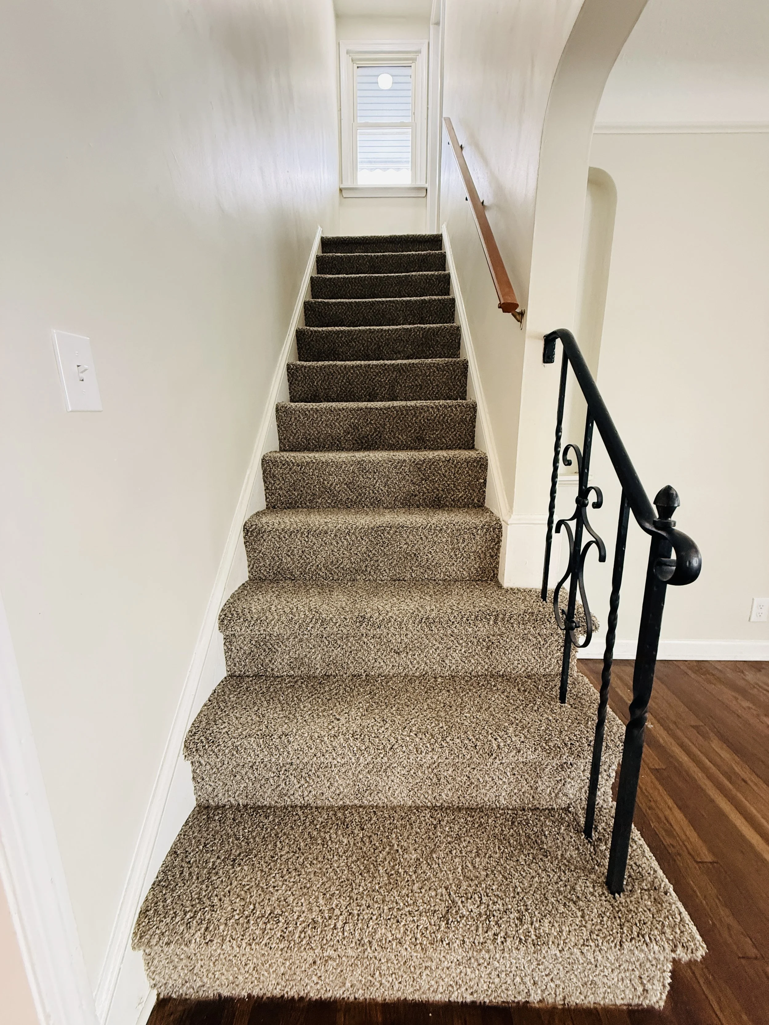 Carpeted staircase with metal and wooden handrails, leading up to a small window at the top.