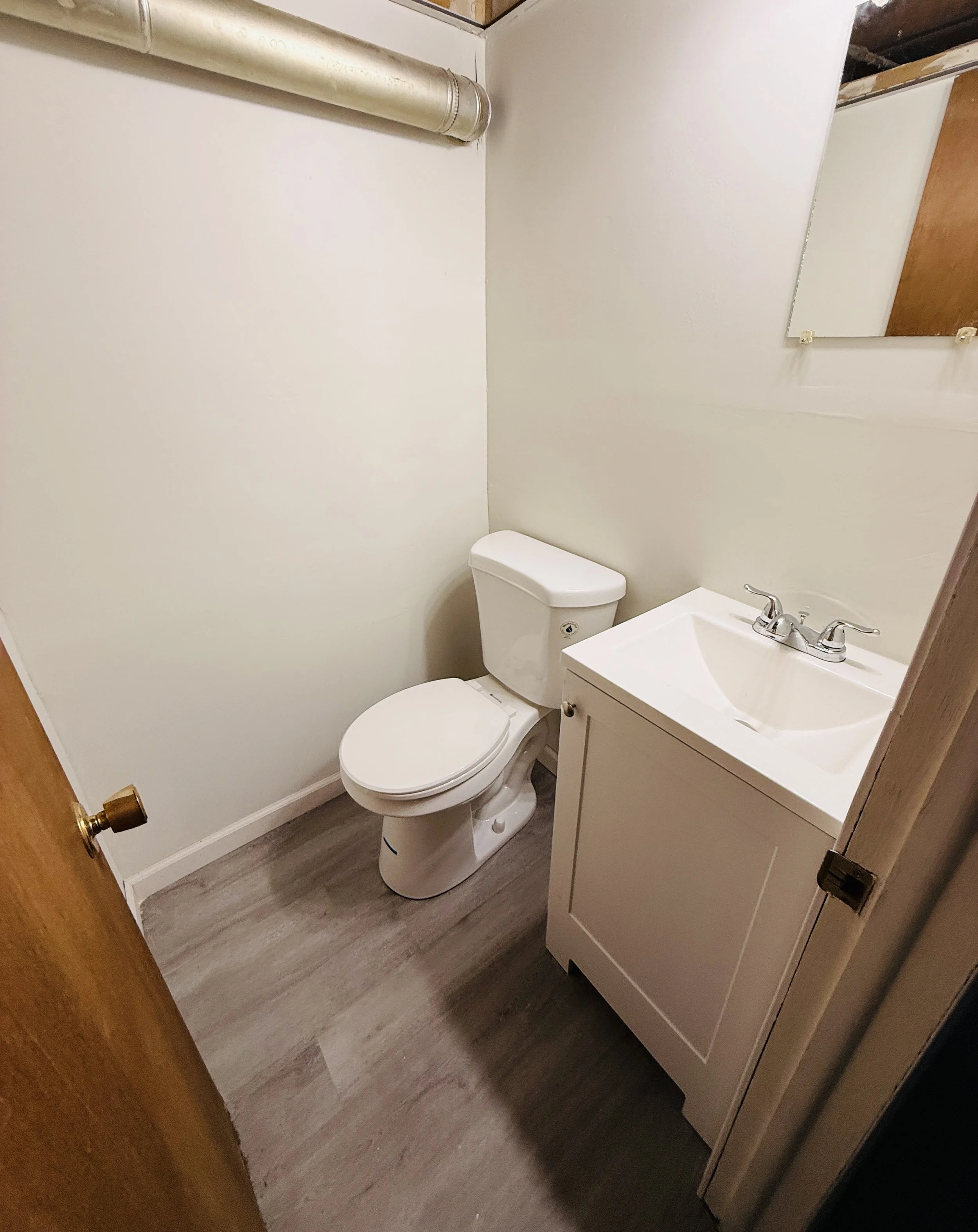Small bathroom with a toilet, a sink with a cabinet, a mirror above the sink, a wooden door, a white wall, and a metal pipe running along the wall.