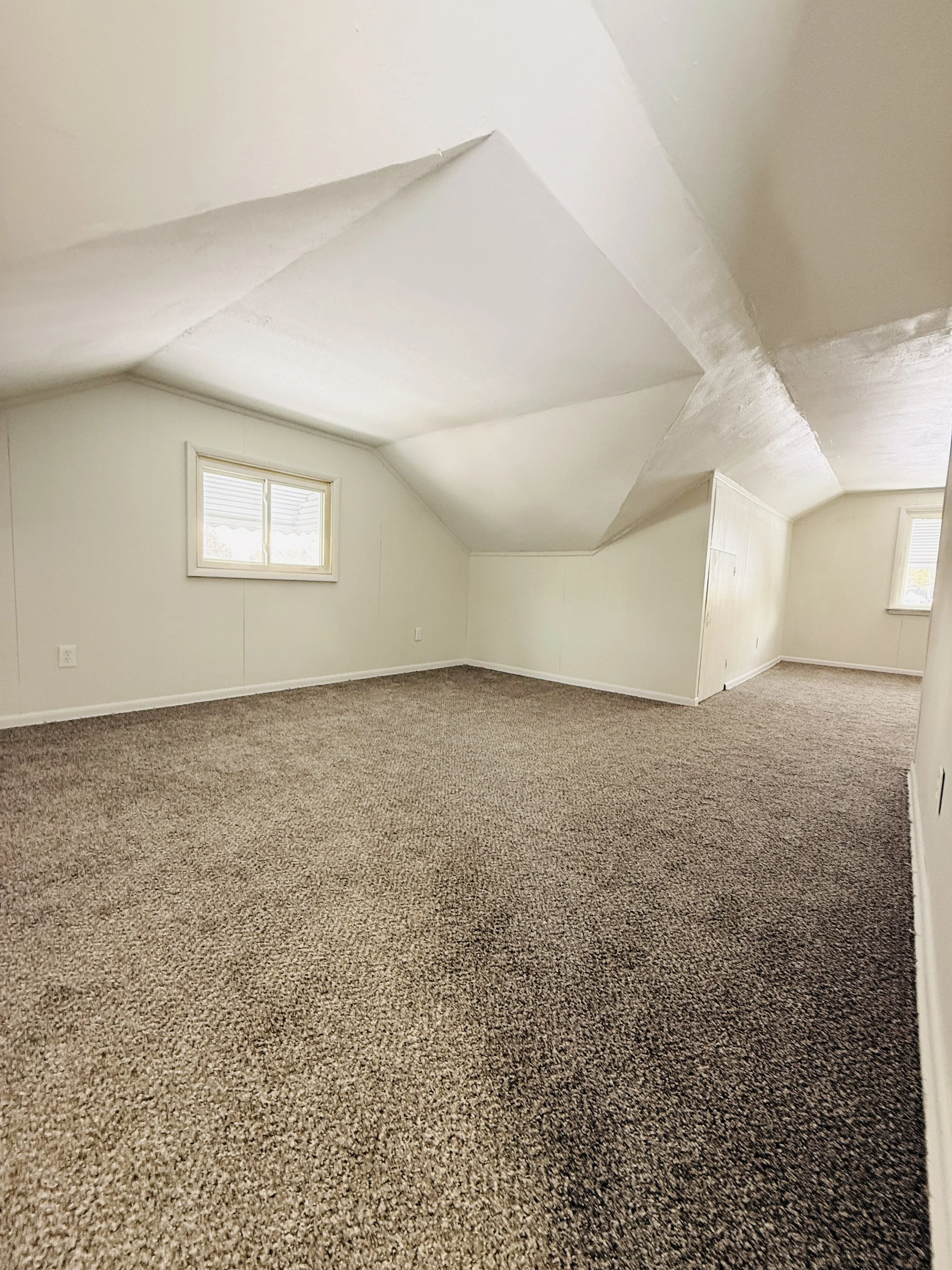 Empty attic room with sloped ceiling, small windows, beige carpet, and white walls.