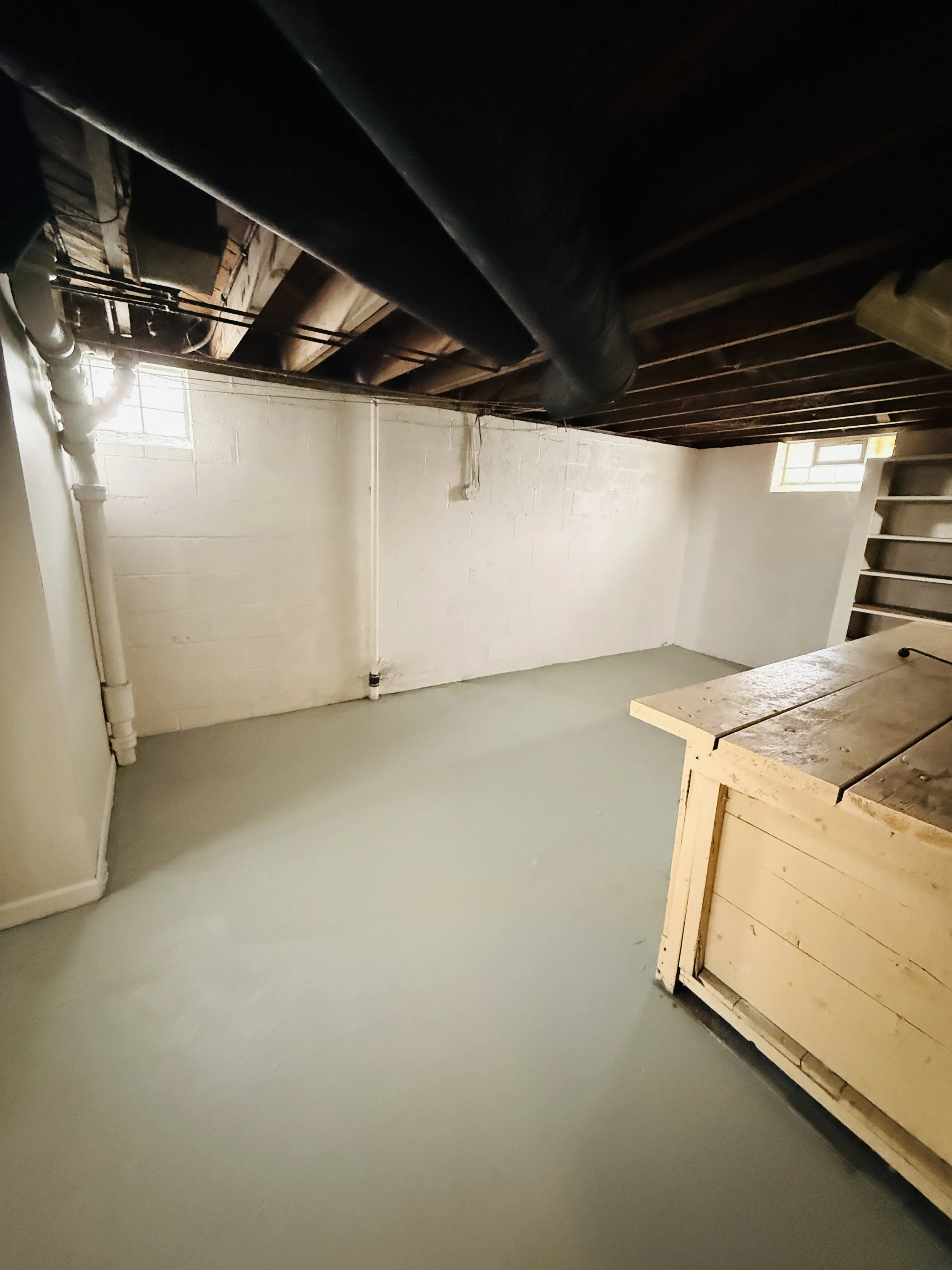 An unfinished basement with a concrete floor, white brick walls, exposed ceiling beams and pipes, small windows, and a wooden storage chest.