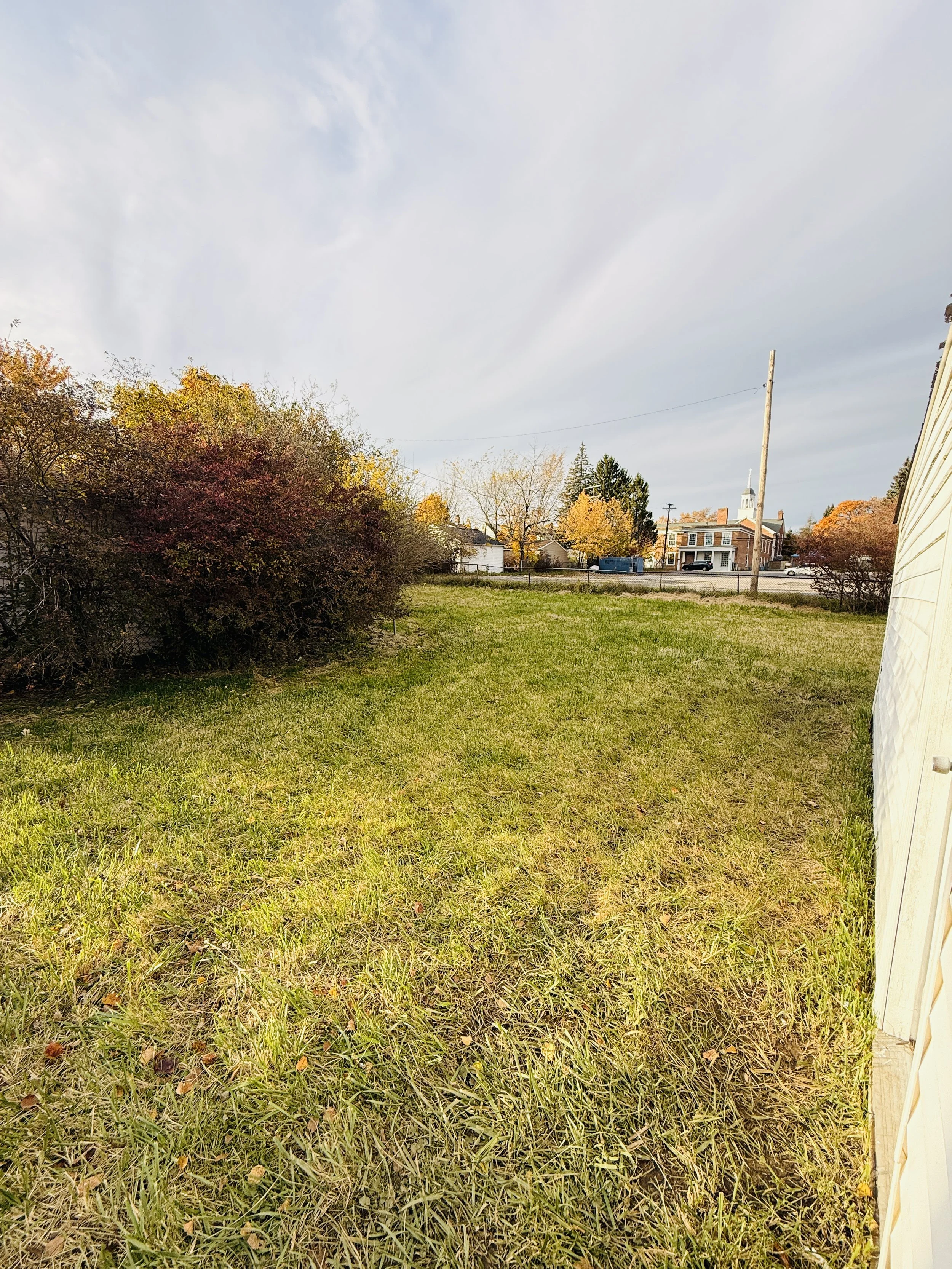 A backyard with grassy lawn, bushes on the left, trees with fall foliage in the background, and a white house with a yellowish siding on the right. A street with a brick building, some cars, and a church steeple is visible beyond the yard.