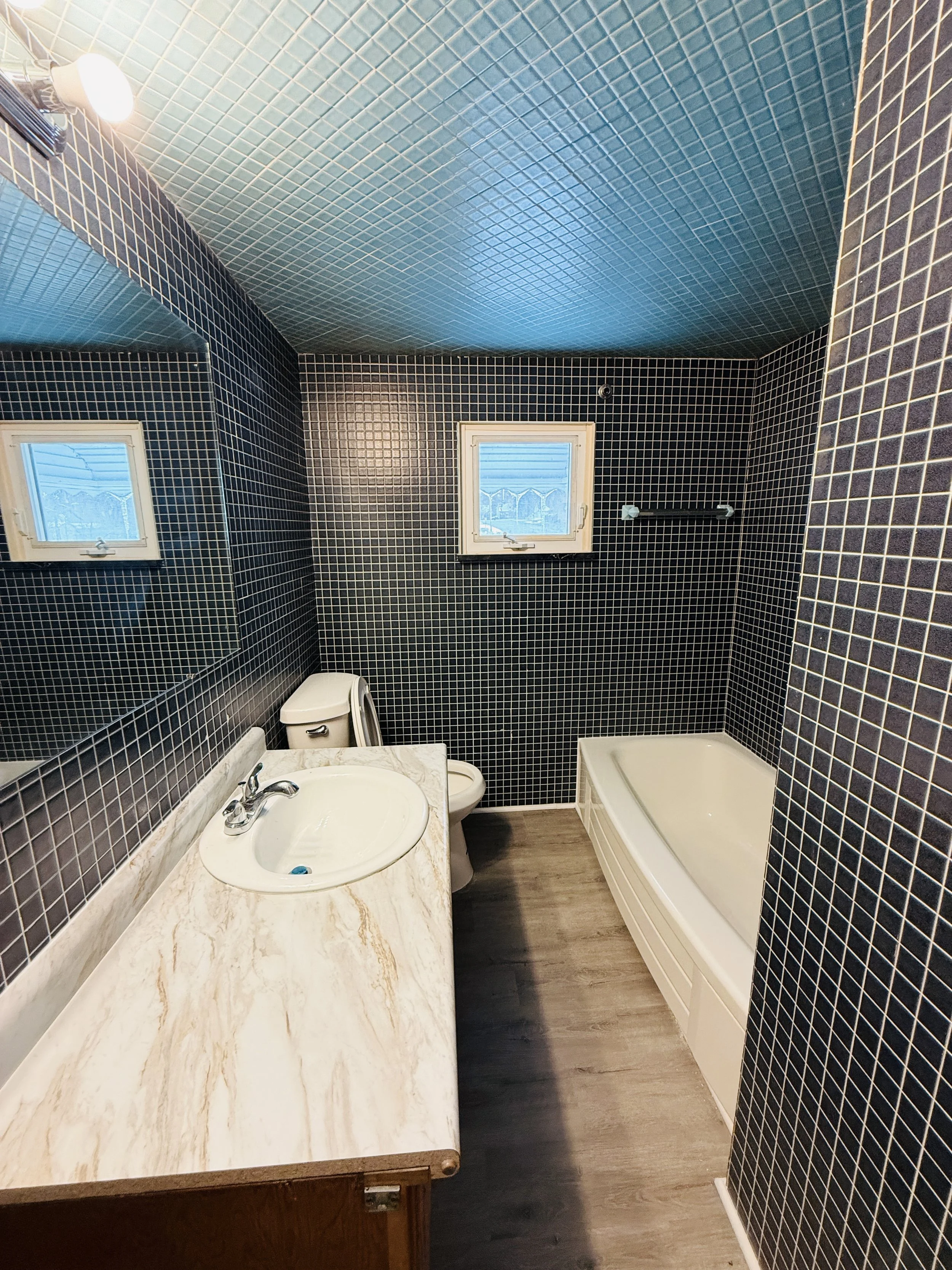 A small bathroom with blue tile walls and ceiling, a marble countertop with a built-in sink, a mirror, a toilet, a window, and a bathtub.