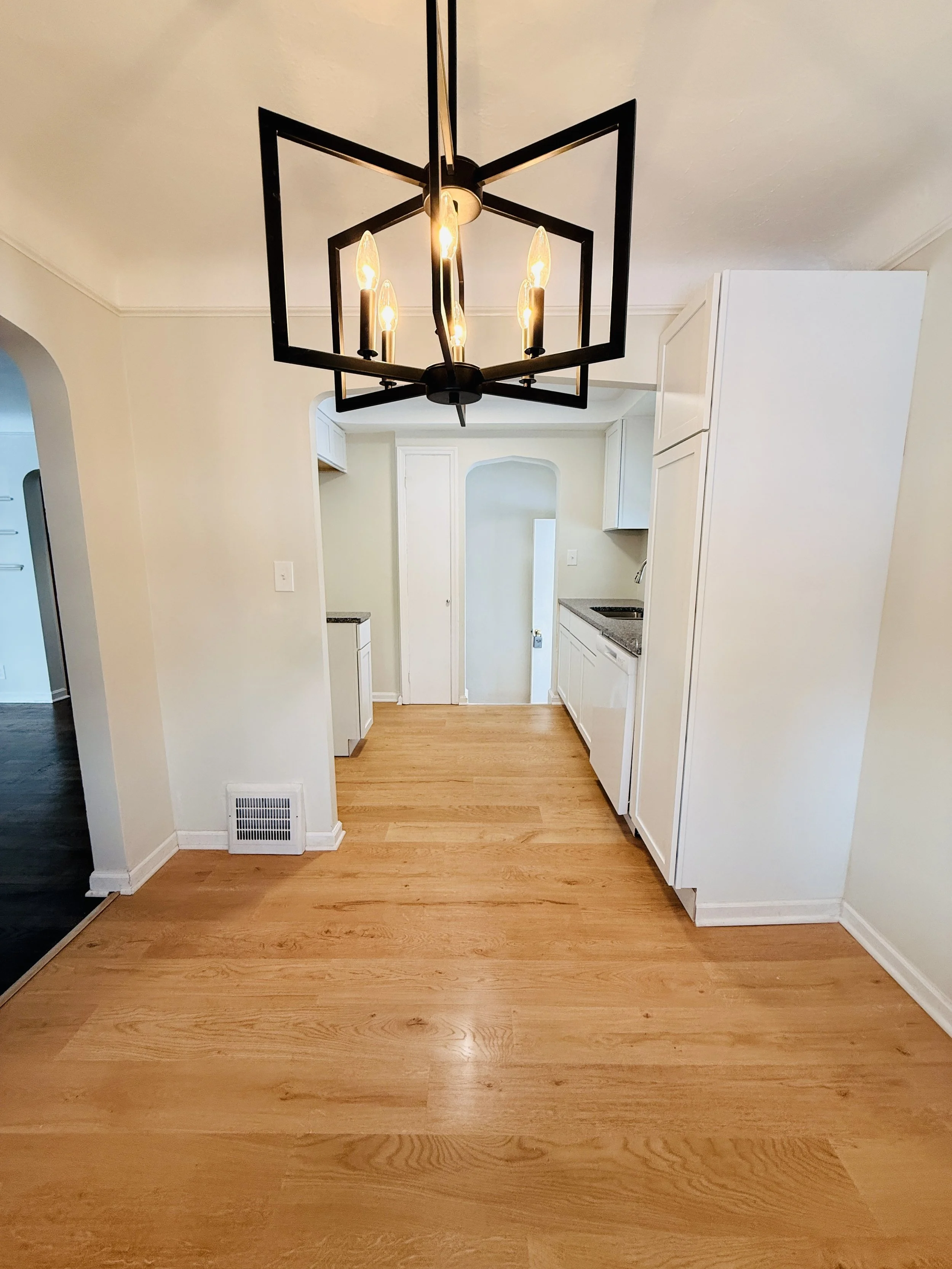 Empty dining area with wooden flooring, white walls, a black chandelier, and a kitchen in the background.