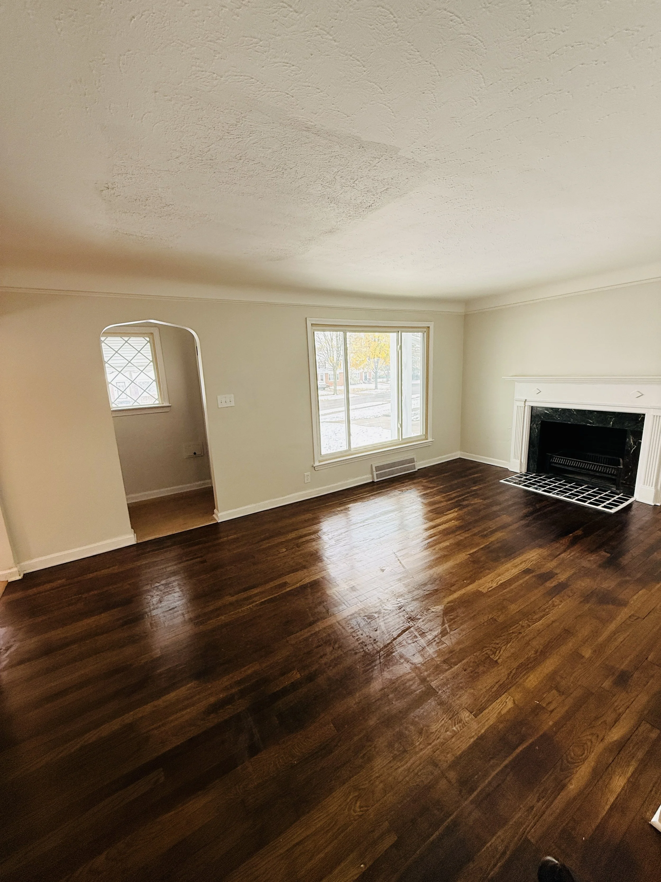 Empty living room with hardwood floors, a large window, and a fireplace with white trim.