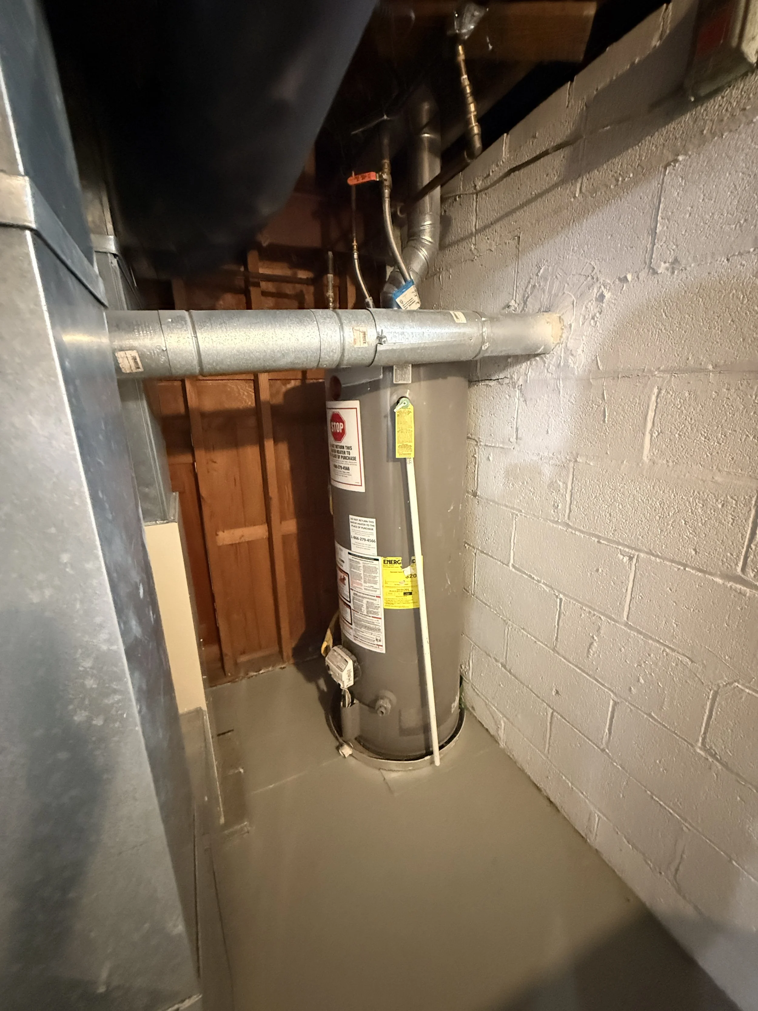 A utility room with a water heater, piping, and metal ducts against a white brick wall.